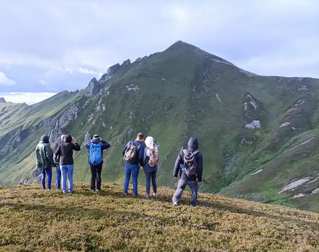 | Découverte des volcans à 360° depuis les magnifiques plateaux d'altitude ; votre accompagnateur vous retrace ce qui fait aujourd'hui le caractère du volcanisme Auvergnat. Un moment de ressourcement au milieu des estives fleuries. | |
